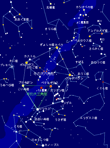 冬の星めぐり![]() 新潟の冬は北西の季節風が吹きこむと晴天に恵まれることはめったにありません。それでも冬型の季節配置の緩んだ時に見える冬の星々は一年中で一番豪華な輝きを放っています。 上空を見上げるとホタルの群れのようなおうし座のすばる(プレアデス星団)が浮かんでいます。その下にはアルデバランが赤い光を放っています。 さらに北の方に目をやると,ぎょしゃ座のカペラが明るく輝き,その下にはふたご座のカストルとポルックスがなかよく並んでまたたいています。 オリオン座は冬の星座の王者です。赤いベテルギウスと青白いリゲルの2つの1等星を含む長方形の中に,等間隔に並んだ3つ星が並んでいます。オリオン座の周辺にはオリオンの大星雲やバラ星雲などの散光星雲がボンヤリと見えます。 ベテルギウスと冬の淡い天の川をはさんで輝く小犬座のプロキオン。そして夜空を刺すような大犬座のシリウスの白い輝き。ベテルギウス,プロキオン,シリウスの形作る正三角形が「冬の大三角形」です。 そして,カペラ,アルデバラン,リゲル,シリウス,プロキオン,カストル6つの1等星を結んでできるダイヤモンドの形「冬の大六角形」は,冬の星座を知るための良き目印となってくれます。 また南の空低く,南極老人星として知られているりゅうこつ座のカノープスがありますが,新潟からは見ることは無理なようです。 |