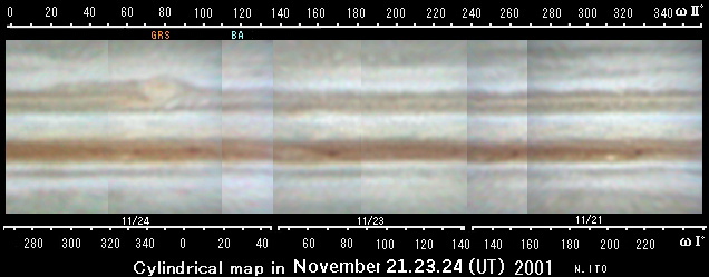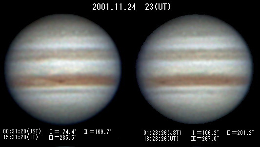 | 2001年11月24日(UT 2001/11/23) 霧雲の合間の撮影。SSTBの小白斑群(2系=157°,172°,189°,202°)が確認できる。EZsの1系115°付近にGWSではないかと思われる白斑がある。NEBのBarge=2系 167 °。 |