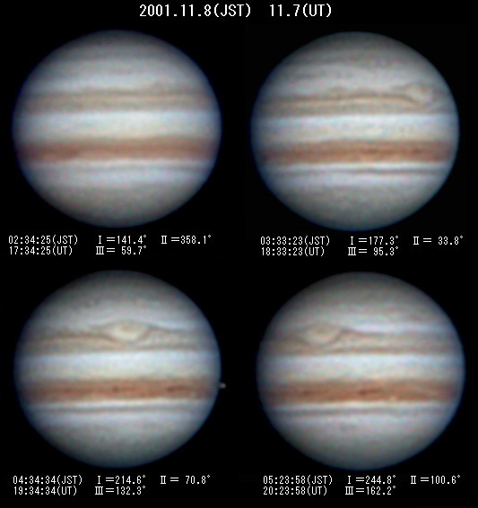 | 2001年11月8日(UT 2001/11/7) 寒気が抜けるにつれて比較的安定した大気の状態になりました。 GRS(2系77°)手前に暗物質が集まっています。このままStreakが形成されるのでしょうか。また,STrZに昨年見られたような暗斑(2系25°,39°)が形成されたようです。STB永続白斑BA=2系124°。NEBのリフトは伸びきって目立たなくなりました。NEBのBarge=2系 333 °,45 °,70°,100°(合体?),Notch=2系312°,120°。 |