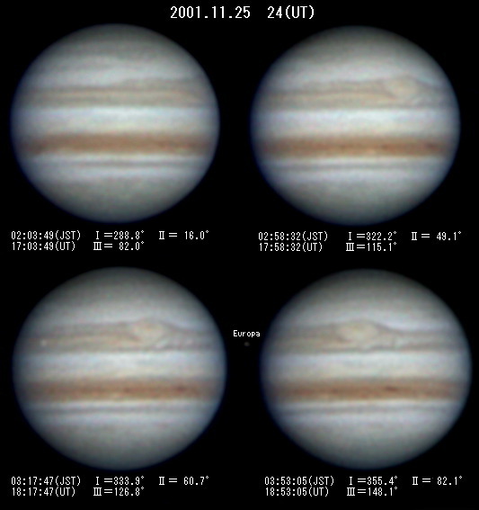 | 2001年11月25日(UT 2001/11/24) 大気の状態は不安定だったが,瞬間的に細部が見られることもあった。GRS(2系=77°)からSTrZ前方にのびる Streakは40°に達した。その前方にはに暗斑(2系26°)がある。STB永続白斑BA=2系119°。SEBnの2系=102°に目立つ白斑が見られる。NEBのBarge=2系 40°,65 °,96°(合体か再び分離か?) 。Notch=2系58°,115°。衛星エウロパが経過。 |
