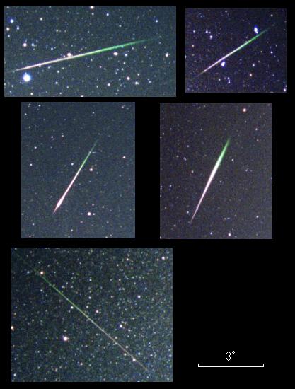 カメラでとらえた しし座流星群の流れ星 11月18日午前2時30分より5時30分までの間に撮影された60枚の写真に写っていた流れ星のなかで,比較的明るかったもの,経路の長かったものを紹介します。 上段 北斗七星付近を流れた流れ星 露出時刻(左)4:21〜27(右)4:15〜20 中段 しし座付近を流れた流れ星 (いずれも地平線方向へ流れた) 露出時刻(左)3:02〜07(右)4:21〜27 下段 冬の天の川付近を流れた流れ星 露出時刻 3:13〜18 なお,いずれの写真も 35㎜F2.8 ASA800ネガフィルム使用して撮影されたもので,同一縮尺でトリミングしています。 また,いずれの流れ星も,流れ始めは緑色で,徐々に白色に変化しているように写っています。 撮影地 群馬県沼田市奈良町 MT-100赤道儀にて自動ガイド |