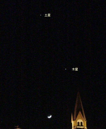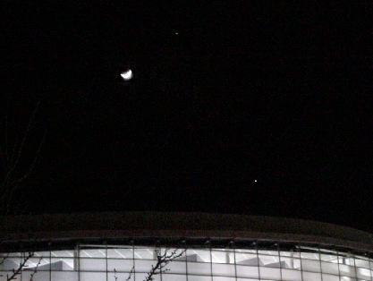 | 月と明るい惑星たち (上から土星,月,木星) 2000年3月10日 PM7:54 新潟市にて 下は市のりゅーとぴあ デジタルカメラで撮影 |