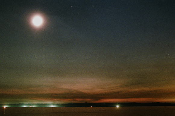 | 佐渡島と月・水星 上の写真の翌日,新潟市の小針浜に水星を探しにいきました。左上の丸い光芒が月齢2.9の月です。この日は低空に薄雲があったため,水星は双眼鏡でやっと見ることができました。画像では中央やや下よりのところにかすかに写っています。上の写真と比べると,わずか1日の違いで月と水星の位置関係が変わっていることがわかります。 中央上に2つ並んでいる星は,ふたご座のカストル,ポルックスです。 *写真データ 2000年6月5日 PM8:02 50mmF5.6 5秒露出 ASA800ネガフィルム |