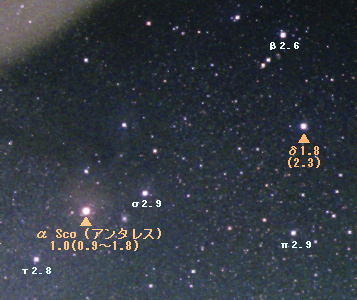 「さそり座」は,夏の南の空に見られる有名な星座です。国立天文台・天文ニュース等によれば,この星座の頭の部分のたてに並ぶ3つの星の真ん中のデルタ星が,今1.8等で増光している(現行理科年表では2.3等と記載)と報告されています。 くじら座のミラなどの変光星を別にすれば,新星以外でこの ように眼視でわかるほどの変光があるのは、きわめて珍しいことです。 さそり座デルタ星はBe型というスペクトル型に分類されます。この型の星は一般に,高速で自転していて,遠心力によって放出されたガスで,星の周囲に円盤が生じ,そのでき具合によって、変光したり、することがあると考えられています。さそり座デルタ星も何かの理由でガスの噴出があって,増光したのではないかとのことです。 参考 アストロアーツ・天文ニュース |