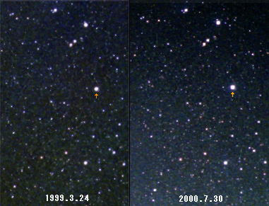| 先日撮影した画像と,1年4カ月前に撮影したものを並べてみました。はっきりわかるほどの違いはありませんが,わずかに明るさが増している印象を受けます。また,画像処理ソフトでそれぞれの日のベータ星との輝度を比べてみると,2000年7月30日のものが2割ほど高くなっていました。 通常より0.5等明るく見られるとすると,市街地など普段あまり暗い星が見られないような場所でも容易に見つけられると思います。夏の夜空を見上げるよい機会になると思いますので,ぜひ見ておきましょう。これからもっと明るくなる可能性もあります。 写真データ 上段および下段右 2000年7月30日PM9:20 新潟県妙高高原町笹ヶ峰(右上隅のものは雲) 下段左 1999年3月24日AM1:50 新潟県五泉市大蔵 共通 50mm F2.8 ASA800ネガフィルム 5分露出(一部をトリミング) |