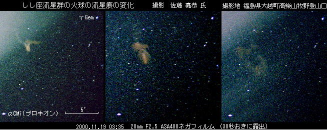 [11月20日 2001年への期待高まる] 日本流星研究会の速報を見ると18日 4:00〜5:00で30個弱程度の出現があったようです。翌日,新潟は天候に恵まれず,私は観望を行いませんでした。実際に見られた方の情報では数は少なかったようですが,19日の午前3時35分25秒に,東北〜中部地方にかけて,数分以上も痕が残る火球が見られたとのことです。この火球の流星痕を撮影された亀田町の佐藤嘉恭氏より画像をいただきましたので,下記に掲載します。 さらに,国際流星機構によれば,海外では18日12時,16時(いずれも日本標準時)に,それぞれZHR300弱(理想的な条件での数字なので,見られた数は半分〜1/3程度),450強の活発な活動が観測されました。17日17時の小ピークも含め,これらはイギリスのやアッシャ博士の予測によく当てはまるとのことです(数の上ではむしろ上回っていた)。同博士の予測では,来年11月18〜19日未明にかけてアジアで規模の大きな流星群の活動が見られるとされており,今年の結果から,来年のしし座流星群が非常に楽しみになってきました。 今年見られる流星群は12月13日夜半から14日未明にかけてピークを迎える「ふたご座流星群」があります。あいにく今回のしし座流星群以上に月明かりの影響を受けてしまいますが,数の上では上回るものと期待しています。天候に恵まれた地域の方はぜひ夜空を見上げてみてください。 |