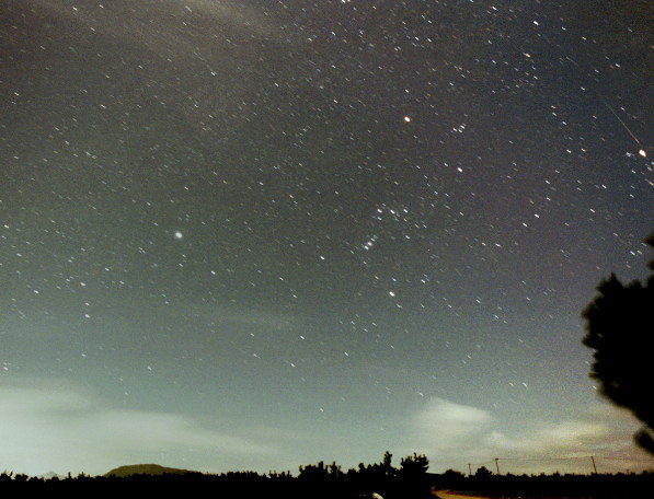 中央やや右寄りにオリオン座,左の明るい星がおおいぬ座のシリウス。右端の明るい星が木星で,そのすぐ上に流れ星が写っています。 撮影データ 2000年11月18日 04:56〜58 流星出現時刻(04:57:50ごろ) 24mm F2.8をF4に絞る ASA800ネガフィルム 固定撮影 撮影地 新潟市内野上新栄町(左下の山は角田山) *景色が明るいのは月明かりのため |