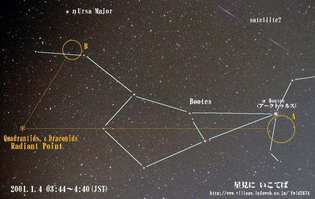 | 2001年1月4日 明け方に見られたりゅう座ι群の流れ星(*は放射点) | ||