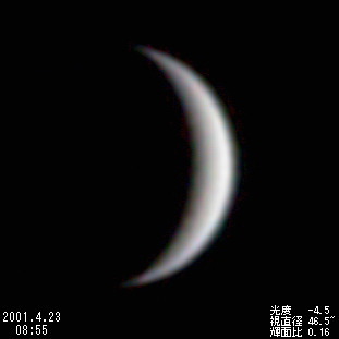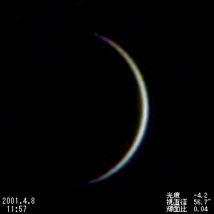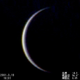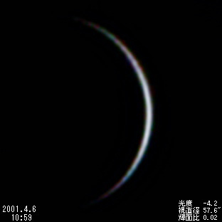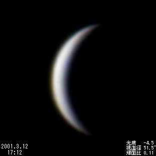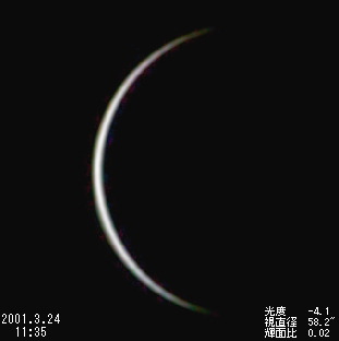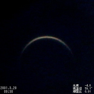 | *内合近くの細い金星は,透明度・大気の状態によって見え方が大きく左右されました。内合当日(3月28日)も前回(1999年8月19日)に引き続き10cmの屈折望遠鏡でも見ることができましたが,見え方は今一つでした。2周期後の2004年6月8日には130年ぶりとなる金星の太陽面通過が見られます。ビデオ画像コンポジット | |