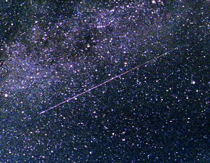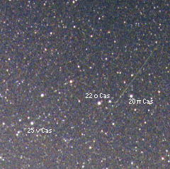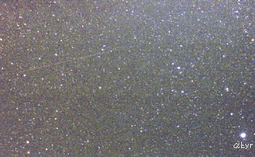| [写真データ] (上)カシオペヤ座を流れた流れ星 2001.8.13 23:53〜58 50mmF2.8 (下) こと座付近を流れた流れ星 2001.8.14 00:08〜13 35mm F2 ASA800ネガ ガイド撮影 流れ星周辺のみトリミング |