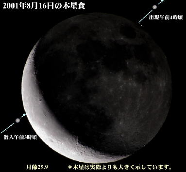 [木星食]明け方東の空に姿を現すようになった木星が月齢26の細い月にかくされる「木星食」が8月16日の未明に全国で見られます。 隠れていく様子は,肉眼でもわかりますが,双眼鏡や望遠鏡を使うと,衛星イオを皮切りに木星本体が約60秒かかって隠れ,さらに残りの3つの衛星も順に隠れていく様子がわかり,より楽しめるでしょう。詳しい時刻は下の欄を参照ください。なお,潜入のころの高度は新潟で20度,出現が30度ほどなので,北東k の開けた場所が必要です。 1997年には土星食が全国で見られましたが,夜間,日本全国で見られる木星食は1944年3月7日以来,実に57年ぶりになるそうなので見逃さないようにしたいものです。 |