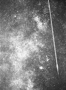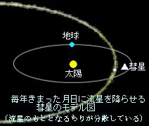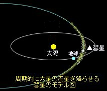 それが幾度となく繰り返されるうち,ちりは彗星の軌道に沿って広がっていきます。そのちりの群れと,地球の軌道がごく接近した時期に,多くの流れ星が見られるというのです。![]() さらに,この流星群の中には,ある周期ごとに大量の流れ星を降らせるものがあります。中には,1時間あたり数万個といった記録さえ残っています。こうした流星群は,もととなる彗星の太陽に近づいた回数が少なく,ちりが十分に広がっていないため,ちりの密度の濃い所で大量の流れ星が見られるのはないかと考えられています。 ![]() 「しし座流星群」(周期33年)は,2001年も,まだ大量の流れ星が見られる可能性があります。 ちりの集まり方が均一でないため,必ずしも大量の流れ星が見られるとはかぎらないのですが,来年は息子を夜中に起こして一緒に見てみたいと考えています。 *モデル図では,彗星の軌道と地球の軌道が2度接近しているように見えますが,お互いの軌道面は水平でないので,接近するのは1度だけです。 |