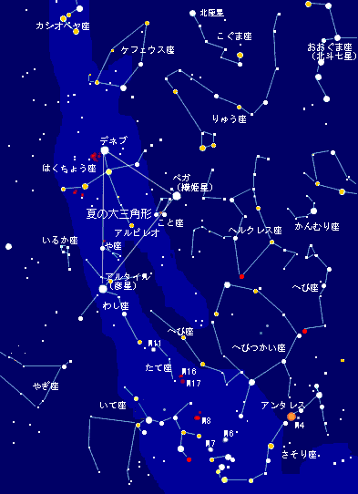 ![]() (星座名などをクリックしてみてください) 夏は天の川が一年のうちでいちばん雄大に見える季節です。 南の空に目を向けると,頭部を北に向けたさそり座がみごとなSの字をえがいています。さそりの心臓には明るい赤い星,アンタレスが輝いています。 さそり座とすぐ東のいて座あたりが,銀河系の中心方向で,天の川が変化に富み,最も美しく見えるところです。(さそり座の見どころ,いて座の見どころ,いて座の散光星雲) 頭上のあたりにひときわ明るく輝く星は,七夕のおり姫星ベガです。天の川をへだてて輝く彦星アルタイル,それに白鳥座の十文字の尾に輝くデネブも明るく輝いてます。 それぞれこと座,わし座,白鳥座の1等星で,この3つの星を結んでできる大きな三角形を「夏の大三角形」といいます。 このあたりには小さな星座がいくつかあります。かんむり座,いるか座などは均整のとれた星の並び方で人気のある星座です。 お盆前の8月12日前後は,ペルセウス座流星群の流れ星がたくさん見られる時期です。ペルセウス座がのぼる夜半過ぎには,空の暗い所では1時間に50個以上の流れ星を見ることができます。 (水色の字をクリックすると,画像と解説が見られますよ) |