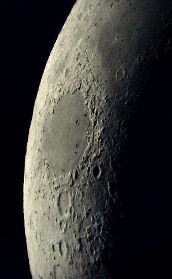 危機の海 (倒立像) 望遠鏡で三日月を見た時に,最も目立つ地形が「危機の海」でしょう。地球から見ると,月の東縁にあるため,縦に長い楕円形に見えますが,実際は縦400キロメートル,横500キロメートルの横長の形をしています。 「危機の海」は大型のクレーターの内部に溶岩が堆積したもので,周辺部はリムと呼ばれる複雑な形をした高地でかこまれています。 「危機の海」の西側のプロクルスは,満月のころ,扇形に開いた光条(光の筋)が見られることで知られています。 月齢3.6の月齢に戻る 写真データ ★月齢 3.8 2000年2月9日 17:31 60cm反射+K60mm SONY Digital Mavica LCM-FD83使用 参考文献:「図説 月面ガイド」 白尾元理・佐藤昌三 共著 立風書房 |
