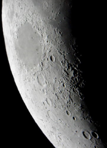 月齢4 中〜北部 危機の海〜タウルス山脈 (倒立像) 上部の左側にある楕円の海は,月齢3で紹介した「危機の海」です。月齢が1違うだけで,周辺部がなだらかになった印象を受けますが,これは,太陽のあたる角度が高くなり,影が短くなるためです。月の欠け際では,太陽のあたる角度が低く,影が長くなるため,ダイナミックな地形の様子がわかります。 中央の欠け際に見える複雑な地形は,タウルス山脈と呼ばれ,月の古い地形の残っている部分です。その北側(下)は,夢の湖,そしてアトラス(左),ヘラクレス(右)との2つのクレーターが仲良く並んで見えます。 月齢4.2の月齢に戻る 写真データ ★月齢 4.2 2000年3月10日 18:20 60cm反射+K60mm SONY Digital Mavica LCM-FD88使用 参考文献:「図説 月面ガイド」 白尾元理・佐藤昌三 共著 立風書房 |