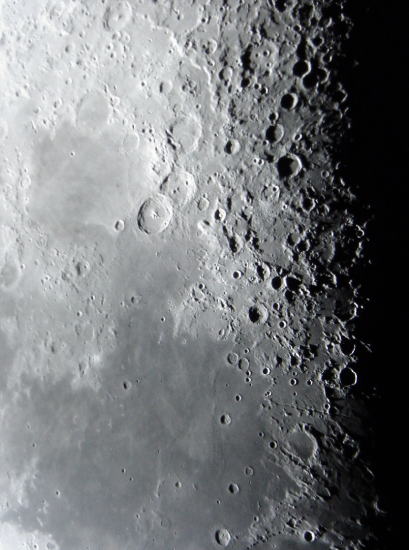 神酒の海〜静かの海 (倒立像) 画像の上の部分にある「神酒(みき)の海」 は,うさぎの模様の耳の1つにあたるところです。外周が二重になっており,外側の崖を「アルタイの急崖」といいます。上部中央には,縦に3つ(上から「カタリナ」「キリルス」「テオフィルス」)のクレーターが並んでいます。 画像下の部分にある「静かの海」は,うさぎの模様の顔にあたるところです。人類初の月着陸となったアポロ11号ので有名な場所です。着陸した場所は,静かの海の上部になります。 画像右下の部分に「アリアデウス谷」と呼ばれる,細い一本のすじがあります。これは,幅5キロメートル,長さ200キロメートルにもおよぶ地溝で,その右側には「ヒギヌス谷」があります。 月齢6.2の月齢に戻る 写真データ ★2000年3月12日 18:46 60cm反射+K60mm SONY Digital Mavica LCM-FD88使用 参考文献:「図説 月面ガイド」 白尾元理・佐藤昌三 共著 立風書房 |