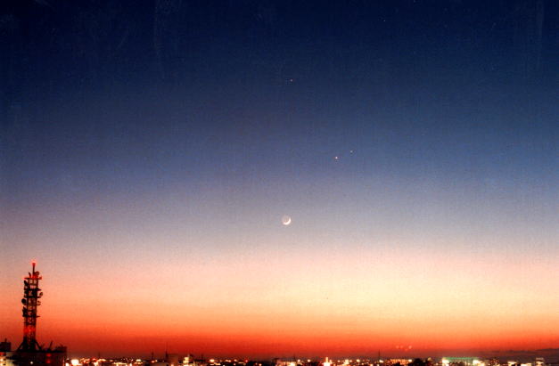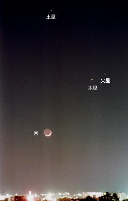 ![]() 撮影データ [夕空に月・惑星が集合] 2000年4月6日 18:55 50mm F5.6 2秒露出 ASA800ネガフィルム使用 (同拡大) 19:05 135mm F5.6 3秒露出 いずれも自然科学館屋上にて [望遠鏡で見た惑星] 土星 18:34 火星 18:32 木星 18:27 新潟県立自然科学館 60cm反射望遠鏡(F15) K-40mm拡大撮影 SONY デジタルビデオカメラ DCR-PC100画像より各5〜7枚合成 [月齢1.6の月] 18:42 新潟県立自然科学館10cm屈折望遠鏡 K60mm 拡大撮影 SONY デジタルカメラにて撮影 |