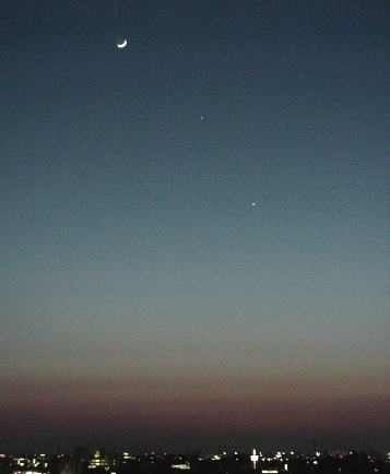 2000年4月7日 夕空の月と惑星 (上から月齢2.6の月,土星,木星) |