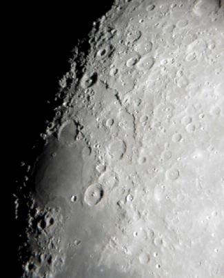 月齢19 拡大 (倒立像) このころ目につくのが,月齢4〜5のころ目立っていた「神酒(みき)の海」です。中央の外周が二重になっており,外周にあたる部分を「アルタイの急崖」と呼んでいます。 月齢19の月齢に戻る 写真データ ★2000年7月21日 03:08 60cm反射+K60mm SONY Digital Mavica LCM-FD88使用 参考文献:「図説 月面ガイド」 白尾元理・佐藤昌三 共著 立風書房 |