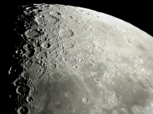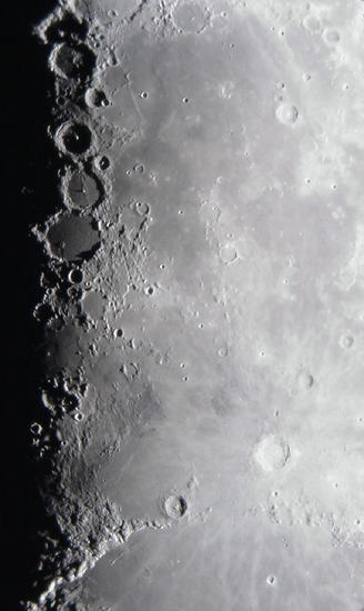 | 下弦の月 南部拡大(倒立像) 下弦の月は,上弦の頃と同じように欠け際のクレーター群が楽しめます。画像上部の大きなクレーターは「グラビウス」で,その下に光条をもつことで有名な「ティコ」があります。また,画像左下には,「直線壁」と呼ばれる,まっすぐな筋が見られます。月齢が8〜9のころは黒い筋として見られましたが,このころは白い筋として見られことから,この壁は西(右)側に低くなっていることがわかります。 |