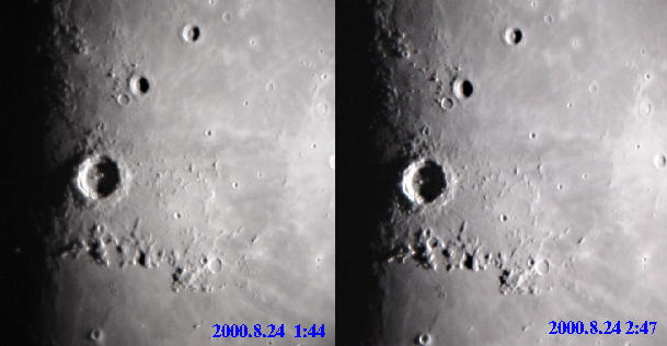 | コペルニクス付近の1時間の変化 クレーターの中にある中央丘に注目すると,わずか1時間でも,光の当たる方向が変化しているのがわかります。 |