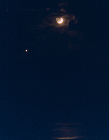 沈む月(月齢1.6)と金星 |