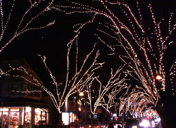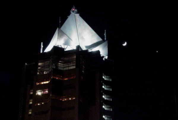 | 12月も半ばになり,あちらこちらでクリスマスや年末のイルミネーションの話題が聞かれるようになりました。新潟駅南口のけやき通りでも「2000NIIGATA光のページェント」が12月15日から行われています。通りにある約190本のケヤキに飾りつけられた26万個の電球が大きな光のアーチを作り,訪れた人々の目を楽しませています。 | 宵の明星金星(画像左上)は,夕方南西の空で明るく見やすくなっていますが,さすがにこれだけ地上の光があるとかすんでしまいます。今年の冬は,明るい惑星も加わり,豪華絢爛な星空が見られるのですから,どこかでライトダウンキャンペーンとかしませんかね。 2000年12月17日17:45 (3枚コンポジット) SONY Digital Mavica MVC-FD88にて撮影 |