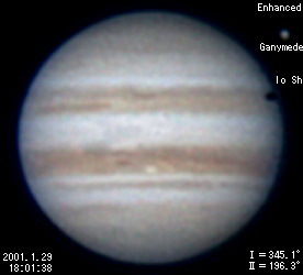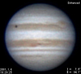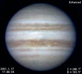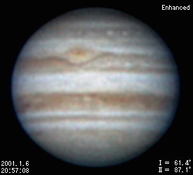 | 2001年1月29日の木星画像 まだ見かけの太陽との位置が離れているため,日没(新潟17:05)少し前から撮影が可能でした。SEBnの変化がおもしろそうです。また2系200°のNTrZの白斑前後に見られたバージのうち後方ものが埋もれて確認できなくなっています。この後天候が悪化。 |