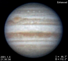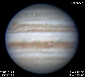 | 2001年1月21日の木星画像 大赤斑点前の暗斑(DS)を撮影しようとしましたが,雲に阻まれてしまいました。一般的に冬場はシーイングが悪いようですが,寒気が緩むと意外に安定していることがあります。SSTBの3つ並んだ白斑の距離が徐々に狭まっています。 |