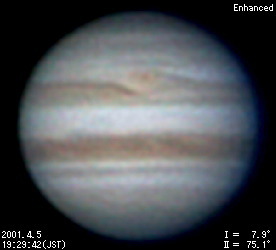 | 2001年4月5日の木星画像 薄曇りのため撮影をあきらめかけていましたが,19時より好転。大赤斑後部に暗物質が集まっており,前方にうっすらとストリークが形成されつつあるようです。暗物質が取り込まれているためか,大赤斑本体(2系76度)のコアが目立ちます。 |