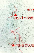 ![]() 残暑お見舞い申し上げます。 今年も流れ星がたくさん流れる時期になりました。 自然科学館にも毎日のように流れ星についての問い合わせの電話がかかってきます。 普段でも1時間に数個の割合で現れる流れ星。でも,8月12日〜13日には 「ペルセウス座流星群」の流れ星が多く見られます。 (この日しか見れないわけではありません。誤解のないように。) ペルセウス座の腕の部分(右の写真の×印)を中心として放射状に流れ星が飛び出てくるように見えるのでこの名前がついています。というわけで今回はペルセウス座の写真を掲載しました。小学校で習ったカシオペヤ座のすぐ下(東)にある星座です。(秋の星座解説は,またの機会に)流れ星を見るには双眼鏡も望遠鏡も必要ありません。シートでも敷いてごろんと横になり,空を見上げていればよいのです。 せっかくだから写真にとっておこうという方は長時間露出のできるカメラに高感度フィルム(ASA400〜800)を入れて空に向けておきましょう。ペルセウス座以外の場所に向けておいてもかまいません。レンズは明るめの焦点距離が短いレンズを使う方が確率が高くなります。かなり明るいものでないと映ってはくれませんがとにかく運が勝負。最後に,虫よけと防寒の対策もお忘れなく。 |
