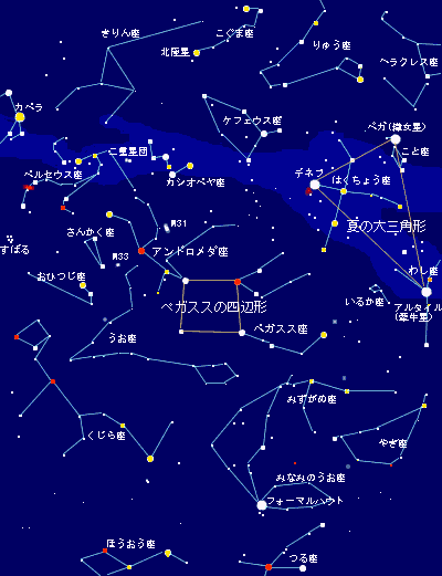 秋の星めぐり ![]() (星座名などをクリックしてみてください) 秋の星空には,夏にくらべて明るい星が少ないので,いつもの季節より星座さがしがむずかしいこともあります。そんな時に便利に使えるのが,ペガススの四辺形(秋の四辺形)です。 まず,東の空から頭の上にかけて,正方形に近い4つの星をさがしてみましょう。これがペガススの四辺形です。 ペガススの四辺形から東に一列に並んでいるのがアンドロメダ座です。アンドロメダ座の南にはさんかく座,さらに東側にはペルセウス座があります。それぞれ,アンドロメダの大星雲,二重星団といった双眼鏡や望遠鏡で楽しめる星雲・星団があります。 次に四辺形の右に並んだ星を下に伸ばしていくと暗い星の並びのみずがめ座を通って,日本では「秋の一つ星」と呼ばれている南の魚座の「フォーマルハウト」にたどりつきます。 反対に左に並んだ星を上に伸ばしていくとWの並びで有名なカシオペヤ座が,その西側にはケフェウス座が見つかります,さらに下に伸ばすとくじら座のβ星「デネブカイトス」にたどりつきます。また,左上と右下の星を結んで伸ばしたところにある逆三角形の星の並びがやぎ座です。 |