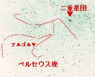 | アンドロメダ座・カシオペヤ座の東側 にあるカーブ を描きながらつらなる星の並びがペルセウス座です。天馬ペガススに乗り,王女アンドロメダを救った勇士ペルセウスの姿が星座になっています。 この星座の名前を有名なものにしているのがお盆の頃をピークに出現する「ペルセウス座流星群」です。 ペルセウス座の腕のところに天の川が濃くなったよう見える二重星団があります。双眼鏡や低倍率の望遠鏡で見ると2つの散開星団(星の集まり)がぴったり寄り添う姿を見ることができます。比較的空の明るい所でも楽しめる星団です。 また,ギリシャ神話によると天馬ペガススはペルセウスが退治したメドゥサの血がしみた岩から生まれたとされています。メドゥサは髪の毛が全部ヘビ,その顔を見たものは,恐ろしさのあまりたちまち石になってしまうという怪物です。ペルセウスはメドゥサを光る楯(たて)にうつすことによって石になるのを避けながら退治しました。 ペルセウス座のβ(ベータ)星,「アルゴル」はペルセウスの持つメドゥサの首のひたいに輝く星です。約3日ほどの周期で2.3〜3.5等まで明るさを変える変光星として知られています。 |