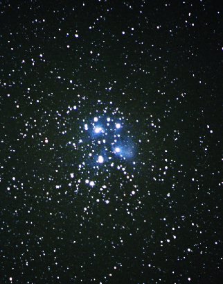 よばひ星,すこしおかし。 尾だになからましかば,まいて」 清少納言の枕草子で一番美しいとされた「すばる」。 「すばる」は集まって一つになるという意味の「統(す)ばる」というれっきとした日本語(和語)です。この他「六連星(むつらぼし)」や「羽子板星」と呼ぶ地方もあります。 中国では昴宿(ぼうしゅく),一般にはプレアデス星団と呼ばれています。この星団が秋の夜半にのぼってくると,冬の訪れを感じさせます。実際に多くの民族ですばるが真夜中に南中(南を通る)するころを冬至としていたそうです。 肉眼でも5〜7個の星に分かれて見えますが,双眼鏡で見ると60〜70個の星々を見ることができます。私は,秋の夜半に北東の山並みからまたたきながらのぼってくる様子を双眼鏡で眺めるのが一番好きです。写真でも絶好の対象で,空の暗いところでは,星々をとりかこむ青いガスも写しとることができます。 光の速さで410年ほどかかるところにあり,生まれて間もない(約8000万年)130個ほどの高温の星々が集まっています。 枕草子ででてくる「ひこぼし」はわし座のアルタイル, 「ゆうづつ」は金星(明星)「よばひ星」は流星のことですが,文章からすると,彗星のことをいっているようですが,この「尾」は,流星痕(りゅうせいこん・流星が流れた後に残る煙のようなあと)であるという説もあるようです。 |