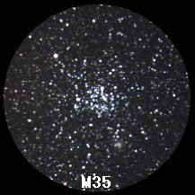 私が冬,望遠鏡で見られる散開星団としてベスト1を選ぶとしたらこのM35をあげます。(「すばる」(M45)は肉眼か双眼鏡の方がきれいだと思います) ふたご座のカストルの足もとにある星団で,天の川の見える空なら肉眼でもぼんやりと存在を確認することができます。 かなり星が密集しており,星に分かれて見るためには8〜16cmの中口径の望遠鏡が必要ですが,視野の中で細かい星々びっしりとまたたきながら寄り添う姿は本当にため息がでます。M35の下に小さな光のかたまりがありますが,これも散開星団(NGC2158)です。 写真データ 1997年10月1日AM2:26〜34 300mmF4.5 他は上の写真と同じ |