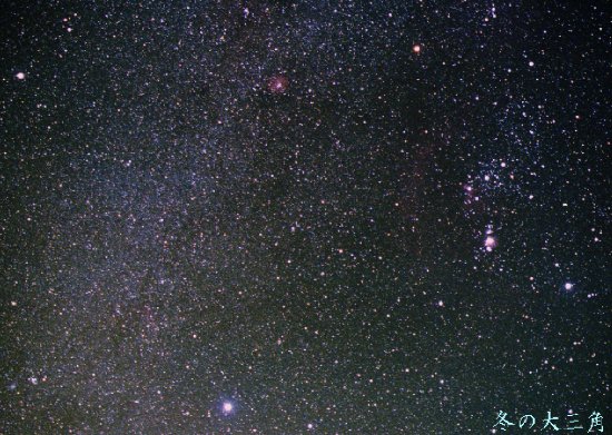 下の写真の右上のオレンジ色の星がオリオン座のベテルギウス,左端の白い星がこいぬ座のプロキオン,そして下の方にあるひときわ明るい星がおおいぬ座のシリウスです。