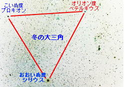 この3つの星を結んでできる正三角形が「冬の大三角形」と呼ばれる星の並びです。中央のたて方向にある細かい星の集まりが,冬の淡い天の川です。 |