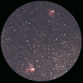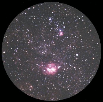 干潟星雲M8と三裂星雲M20 いて座は銀河系中心方向にあるので,天の川が変化に富み美しく見えるところです。星雲,星団がところせましと集まっており,双眼鏡や望遠鏡の格好の対象になります。M8・・・写真中央下のピンク色に見える部分です。肉眼では赤い色までは分かりませんが光のしみがポカッと浮かんだように見えます。双眼鏡や低倍率の望遠鏡で見るとサンゴ礁のように見えることから別名「干潟(ひがた)星雲」とも呼ばれています。望遠鏡で見ると ,明るい散開星団(NGC6530)をとりかこむように大きく広がって見え,印象的な散光星雲です。 M20・・・写真の上の方にあるピンク色とブルーのしみのような部分です。写真でははっきりわかりませんが,暗黒星雲によって3つに引き裂かれたように見えることから「三裂(さんれつ)星雲」と呼ばれています。 写真データ 1997年7月24日 20:47〜55 300mmF4.5 新潟県岩船郡 神林村 南大平キャンプ場 |