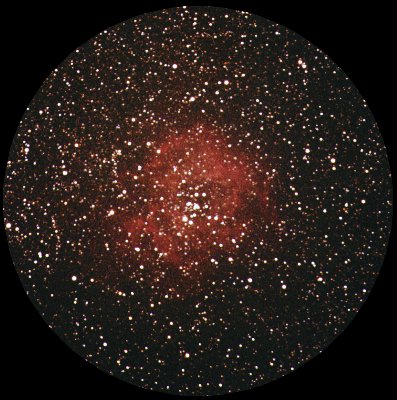 | おまけ あこがれのバラ星雲 (ちょっと昔の天体写真の話) ざっと20年前,高校に入りたてのころ,天文雑誌の広告に載っていたバラ星雲の美しさに感激し,ぜひ撮ってみたいと思いました。 当時の天体写真用のフィルムといえば,白黒写真はトライX,カラー写真はスライド用のASA100〜200のものが一般的で,バラ星雲のような散光星雲はトライXではほとんど写らない対象でした。 また,星を点に写すために,望遠鏡をのぞきながら星の動きに合わせて手動で望遠鏡を動かす方法が一般的でした。(だから星の写真を撮る時には星空は見れない・・・) 初めてこの星雲の写真を撮ったのは,4月のまだ雪融け間もない頃で,山に機材をかついでのぼり,寒さに耐えながら20〜30分望遠鏡にへばりついていました。 スライドを見ると,ガイドに失敗して少し流れた星の中でボンヤリと星雲が写っている程度ですが,それでも当時はすごく喜んだの覚えています。 |
