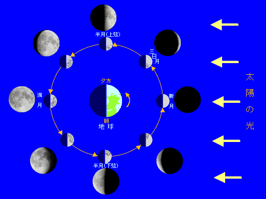 月は太陽とともに,人類にとって最も親しみのある天体の一つです。 太陽の沈んだあとの明かりとして, こよみをつくる基礎となった満ち欠けなど はるか昔から月は人々の生活にとってなくてはならない存在でした。 月の満ち欠けは,どのようにしておこるのでしょうか? |