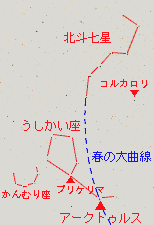3月中旬,春は三寒四温で近づいてきています。東の空に目を向けてみましょう。 春の大曲線と呼ばれる,北斗七星の柄のカーブを伸ばしていったあたりに,オレンジ色をした明るい星が輝いています。この星は,うしかい座の「アーク トゥルス」です。ギリシャ語で「クマの番人」という意味のこの星は全天で5番目に明るく,距離も30光年と比較的近くにあります。 日本では,この星が天頂近くに輝く時期から,「五月雨(さみだれ)星」,「麦星」と呼んでいました。 中国ではこの星を「大角」と呼んでいました。これは,さそり座を巨大な竜(青竜)の姿に見立て,その角をこの星と,おとめ座のスピカとしていたためです。 うしかい座のいわれには,いろいろな説があります。大神ゼウスの妻ヘラの呪いによって変えられた大熊(おおぐま座)を追う息子のアルカスの姿,あるいは,天をせおわされている,石になった巨人アトラスの姿ともいわれています。 このあたりには,小望遠鏡で見て美しい二重星があります。うしかい座のε(イプシロン)星は最も美しいものという意味の「プルケリマ」と呼ばれ青い星と黄色い星がなかよく並んで見えます。 |
