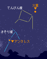 赤い光を放つ火星は,その色から,ギリシア神話の戦いの神「マルス(またはアレス)」の名で呼ばれてきました。この色は,火星の地表の色(岩石に含まれる酸化鉄)のためであることがわかっています。 一方,さそり座の心臓に赤く輝く一等星がアンタレスです。その赤さの理由は,この星の表面温度の低さ(太陽の半分以下(約3000度))によるものです。しかし,その大きさは太陽の230倍で,仮に太陽のかわりに置いたとすると,火星の軌道あたりにまで達するほどです。 アンタレスの語源はアンチ・アレス つまり「火星(アレス)に対抗するもの」です。実際にアンタレスは,惑星の通り道の近くにあり,昔から,両者が近づいて輝く様子は,人々の関心を引いていました。今年は,9月中旬に火星がすぐそばにやってきて,その赤さを競い合うことになります。 ![]() |