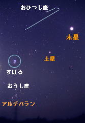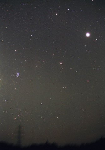 木星・土星 登場! 木々の葉が色づきはじめ,ようやく秋めいてきました。まだ頭の上には,夏の大三角が輝いているのですが,東の空から,秋の星座たちがのぼってきています。 さらに午後6時をすぎると,木星,土星といった,望遠鏡で楽しめる惑星たちがのぼってくるようになりました。 今年の木星は,おひつじ座〜うお座にあり,-3等近くの明るさで一際明るく輝いています。 ![]() 土星は,おひつじ座にあり,0等ほどの明るさで輝いています。 高倍率の双眼鏡で眺めると,木星の4つの衛星,小さいながらも楕円形に見える土星,そして,おうし座にある「すばる」(プレアデス星団)なども楽しむことができ,一層興味が深まることと思います。 このページで今後,木星・土星の画像などを公開していく予定です。 写真データ 1999年9月9日 23:50〜23:57 35mm F2.8 フジASA800ネガ 中蒲原郡村松町 新屋 |