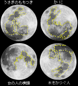 月の模様は何に見える? 昔の人々は,満月に見える模様をさまざまなものの姿に見立てていました。右の図の他にも,ライオン,ワニ,ヒキガエルなどの動物の姿や,本を読んだり,水をくんだりする人の姿に見立てたりしていました。 月にうさぎがいるという話は,中国,韓国,インド,モンゴル,中央アメリカに広がっており,日本には中国から伝わったと考えられています。 参考文献 : 白尾元理,佐藤昌三共著 「図説 月面ガイド」 立風書房 : 志賀 勝著 「月の誘惑」 はまの出版 : 「子供の科学」1995年 9月号 誠文堂新光社 写真データ ★月齢 15.2 2000年2月21日 02:28 16cm反射+or25mm SONY Digital Mavica LCM-FD88使用 |